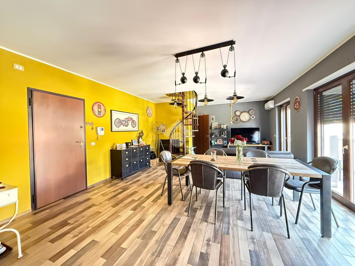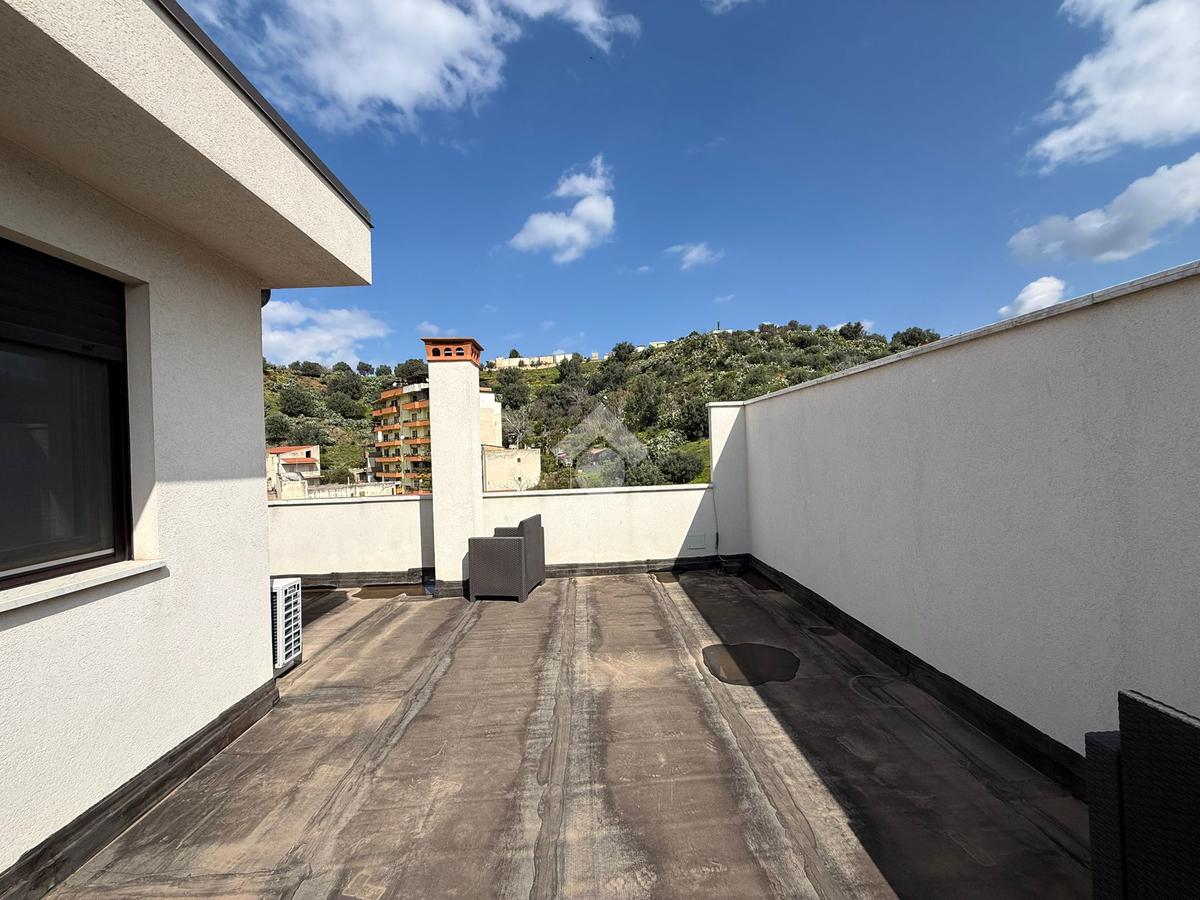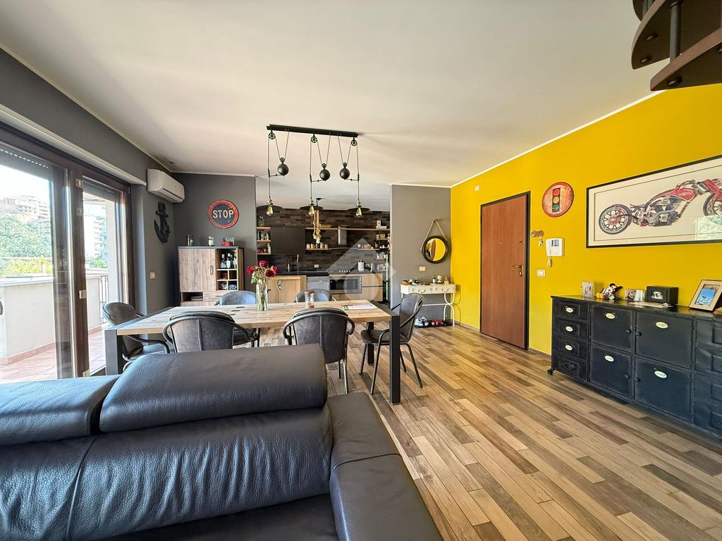 Elemento distintivo dell’appartamento è il balcone perimetrale, che abbraccia l’intera abitazione donando luce naturale agli ambienti e offrendo uno sfogo esterno vivibile. Tramite una scala interna si accede al piano superiore, dove troviamo un esclusivo terrazzo privato, con vista panoramica: uno spazio ideale per momenti di relax all’aperto, arricchito da una comoda zona lavanderia.