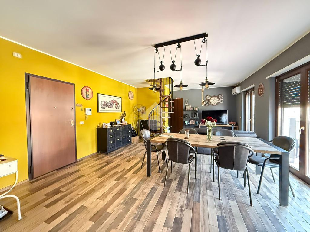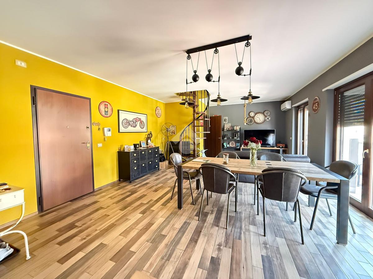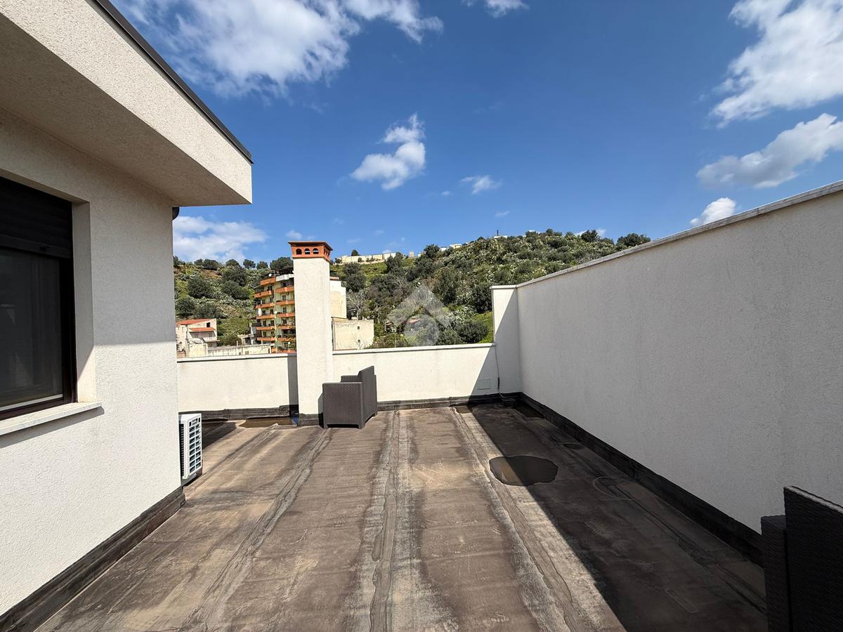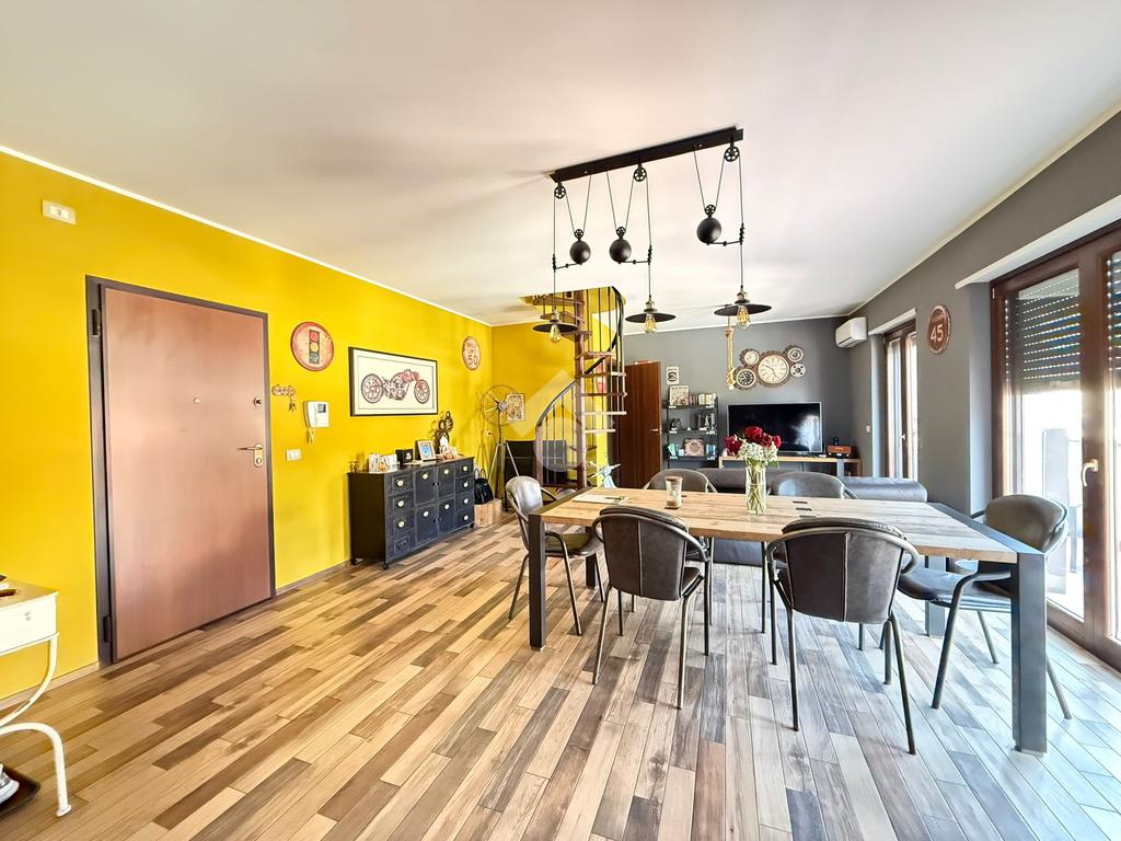 Elemento distintivo dell’appartamento è il balcone perimetrale, che abbraccia l’intera abitazione donando luce naturale agli ambienti e offrendo uno sfogo esterno vivibile. Tramite una scala interna si accede al piano superiore, dove troviamo un esclusivo terrazzo privato, con vista panoramica: uno spazio ideale per momenti di relax all’aperto, arricchito da una comoda zona lavanderia.